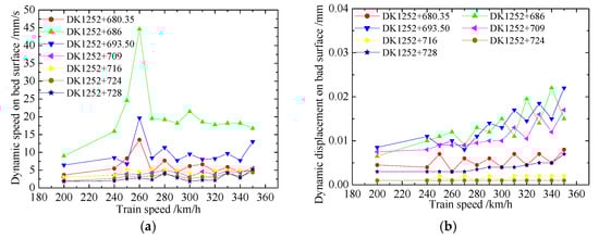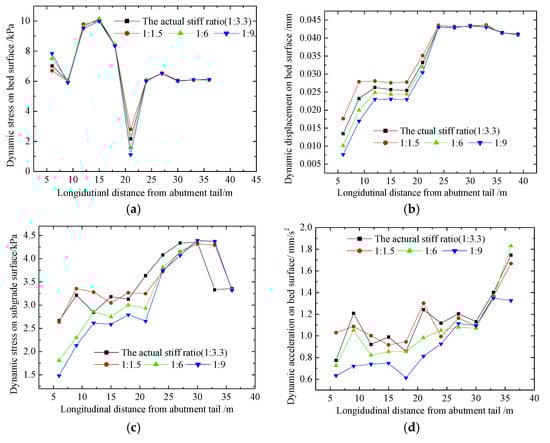 Table 8 reveals that the maximum amplitude of the dynamics do not vary greatly with the stiffness. However, the longitudinal variation characteristics exhibit substantial variation, particularly in the transition section. The greater the stiffness ratio, the smaller the dynamic displacement of the bed surface, yet the opposite is observed for the stress. This may be because the rigidity is the direct result of the displacement. This indicates that the difference in the stiffness of the structures at both ends of the transition section does not have a significant impact on the train passing the transition section. The on-site investigation of the status of the road bridge transition section also revealed that as long as the track is regularly lifted and repaired with ballast, and the track surface is kept smooth, the track inspection car can pass smoothly without the deduction of points.