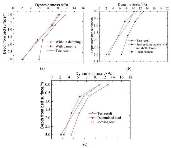 Figure 18a compares the simulated and test results of dynamic stress with and without structural damping. The calculated results with added structural damping are closer to the measured results. This is because the dynamic stress is consistently attenuated along the depth of the subgrade. However, the attenuation degree of the calculated results is less than the mean. Figure 18b compares the simulated and test results of the dynamic stress under different CA models. It is more practical to simulate CA mortar with the spring-damping and shell elements. This is mainly reflected in the dynamic stress of the bed surface. The addition of the spring-damping unit can simulate the damping property of the CA mortar. The dynamic stress simulated by the two methods differs by 2 kPa, while the dynamic stress changes under the bed surface are consistent.