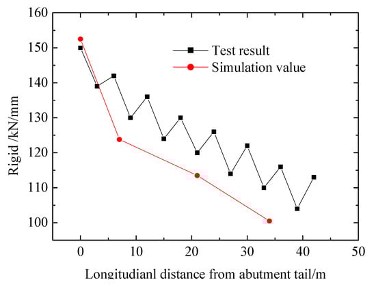 Figure 19 compares the experimental and simulated stiffness. Through simulation analysis, the stiffness of the bridge abutment and roadbed were determined as 150 kN/mm and 95 kN/mm, respectively, with the former just 1.58 times greater than the latter. The stiffness change rate from the bridge abutment to the roadbed through the transition section was calculated as 1.18 kN/mm/m. The variation trend of the comprehensive stiffness at the track with the distance from the bridge abutment is essentially consistent with the experimental results, and the calculated value is slightly smaller than the experimental value. This validates the results of the simulation model. These results are generally consistent with the design requirements, namely, the stiffness ratio of the bridge to the road should not exceed 2. This difference can essentially eliminate the impact of structural mutations, allowing the stiffness of the roadbed structure to transition more evenly. Furthermore, the deflection of the roadbed under wheel load tends to be consistent, greatly improving the service level and driving quality of the bridgehead pavement.