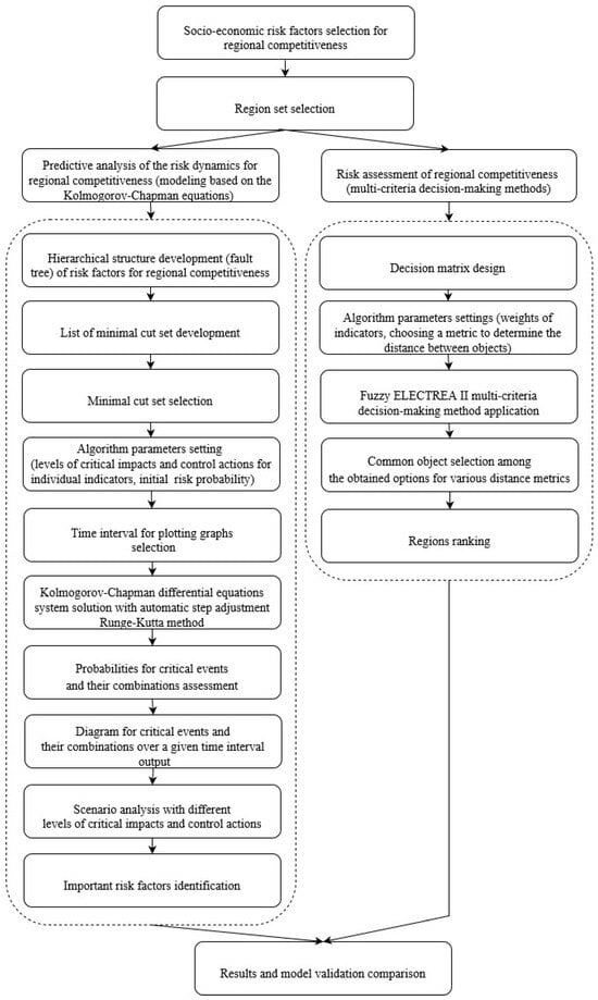 A systemic multifactorial assessment of competitiveness risks takes into account the specifics of regional statistics open data. The functional capabilities of the application include working with two models: an algorithm based on multi-criteria decision-making methods (MMDM) and a method based on the Kolmogorov–Chapman equations. The implemented approach is shown in Figure 1.