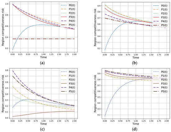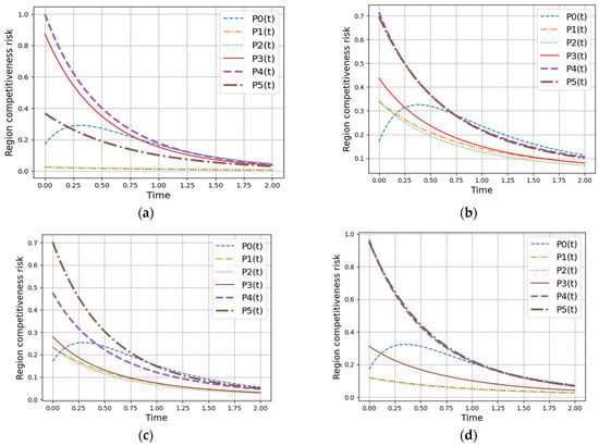 In the first case, critical events are associated with the risks of worsening indicators ; possibility value corresponds the situation when none of the specified events occurs; are the possibilities of events related to the deterioration of indicators , respectively; are the possibilities of events occurring that are related to the deterioration of pairs of various indicators; are the possibilities of events occurring that are related to the deterioration of combinations of three different indicators; is the possibility of the event that occurs with the deterioration of all indicators . The visualization of the constructed dynamic model is presented below (Figure 3). The diagram shows the values for the four regions under study.