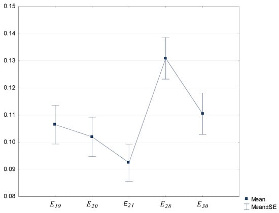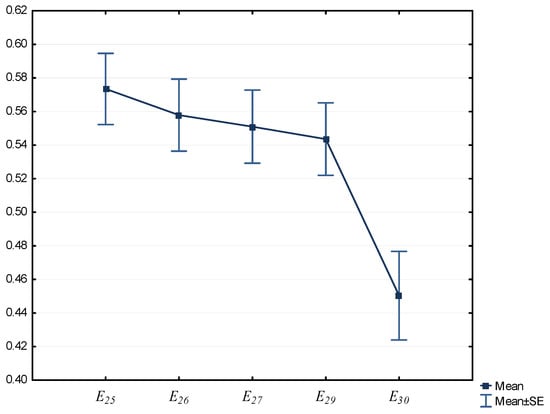 For a comprehensive risk assessment of the regions, the average values M and the standard error SE according to the calculated data for individual competitiveness factors are used. As an example, the estimates obtained for the risk factors included in the section (Figure 5) and (Figure 6) are presented.