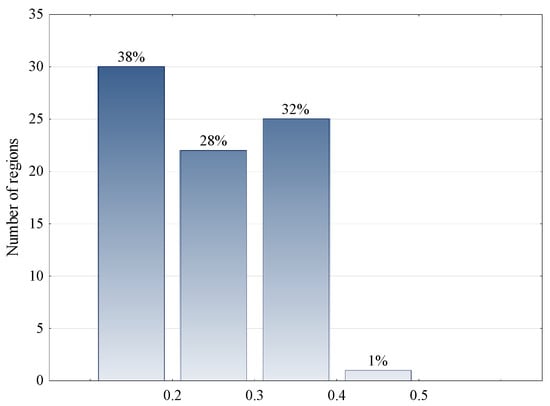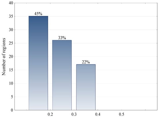 The distribution of regions based on the MMDM by the risk level is presented for the cut set (Figure 7) and the cut set (Figure 8). For the studied list of regions, the analysis of risk factors shows that 32% of regions have a high level of competitiveness risks.