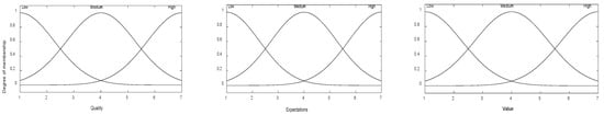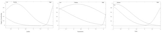 where , , and are one of three membership functions of the input variables (quality), (expectation), and (value), respectively.