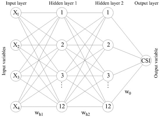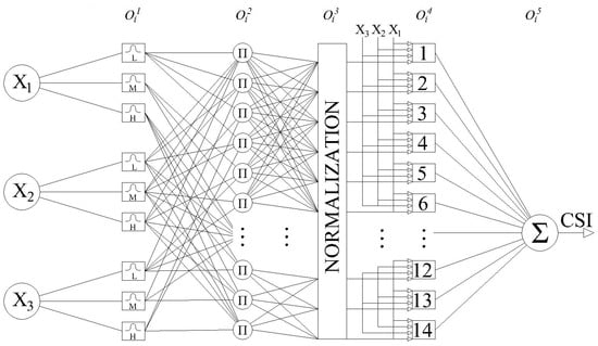 Layer 4. This layer has 14 nodes that represent the output value CSI. Each node of this layer is connected with the normalized neuron from the previous layer. A defuzzification neuron computed the weighted consequent value of a given rule as:
