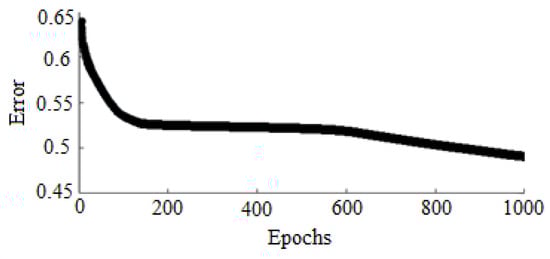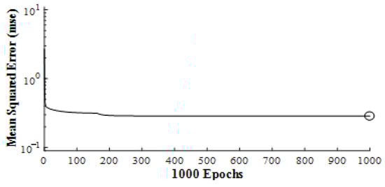 The error is calculated in the same manner as in the case of ANN application to the subject problem. The number of epochs is set to 1000 (Figure 7).