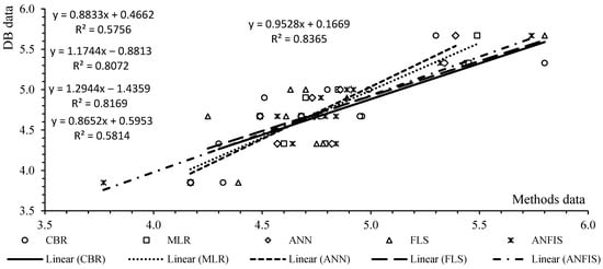 Based on Table 2, the linear dependence between the obtained data from all methods and data from the database is given in Figure 11. The values are 0.5756, 0.8072, 0.8169, 0.5814, and 0.8365 for CBR, MLR, ANN, FLS, and ANFIS, respectively. In comparison with the other methods, it can be concluded that ANFIS fits the database in the best way.