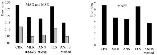 Taking into consideration MAD, MSE, and MAPE, ANFIS yielded a decrease of 16.67%, 16.67%, and 15.26%, respectively, compared to ANN. Also, ANFIS yielded a decrease of 21.05%, 0%, and 18.95% in MAD, MSE, and MAPE, respectively, compared to MLR. Finally, considering MAD, MSE, and MAPE, ANFIS yielded a decrease of 46.43%, 58.33%, and 44.06%, respectively, compared to CBR.