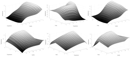 The calculation of CSI is based on “Sugeno” FLS with three input fuzzy sets and one output crisp set. All input fuzzy sets—Quality, Expectations, and Value—are described by three Gaussian membership functions (gmf): low gmf (1.247, 1), medium gmf (1.247, 4) and high gmf (1.247, 7), as shown in Figure 5. The gmf is the abbreviation for the Gaussian membership function, which is characterized by two parameters: function center (c) and function width (σ).