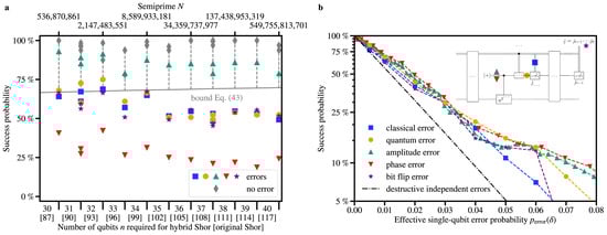 - Bit flip errors (purple stars) are defined by flipping each bit in the final bitstring j with probability . This error model, in contrast to the others, does not affect the execution of the quantum part of the iterative Shor algorithm. While such an error (e.g., a fault in the classical computer memory) may be considered unlikely, it is still interesting to compare its consequences to the errors in the quantum part.