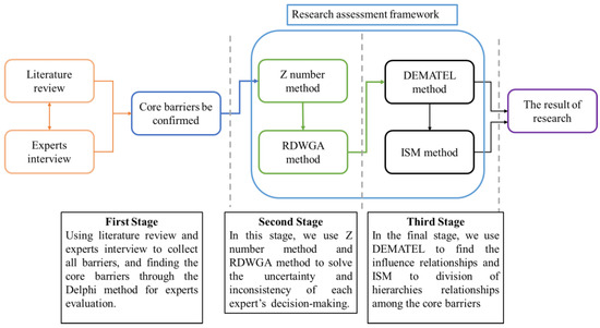 Considering the uncertainty in expert decision-making, the research methodology is divided into three stages. First, we collected individual expert data through expert surveys and the Delphi method was used to identify key barrier factors. Second, the Z-RDWGA was utilized to integrate the inconsistent and uncertain decisions of the experts. Finally, the DEMATEL and ISM methodologies were applied to examine the interrelated causal influences among these factors. For making the research process clearer, the following research flow chart was created, as presented in Figure 1.