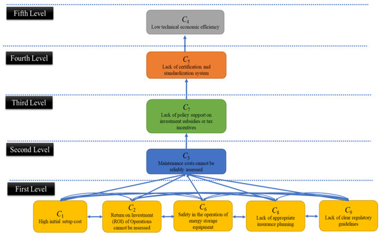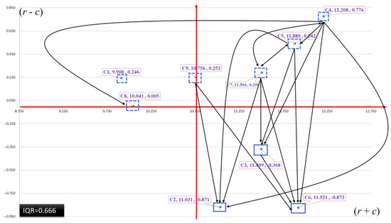 After the total influence matrix is gained, the net influence degree (r − c) and centrality (r + c) of barrier factors can be computed as Equations (14)–(17). The various influence relationships in the overall assessment system can be expressed according to the fuzzy value of the total influence relationship matrix, as presented in Table 12. The crisp values are presented in Table 13. The results show that the top three barrier factors that influence the other barrier factors are C4 (Low technical economic efficiency): 6.492 > C5 (Lack of certification and standardization systems): 6.211 > C7 (Lack of policy support for investment subsidies or tax incentives): 5.898; the top three barrier factors affected by other barrier factors are C6 (Safety in the operation of energy storage equipment): 6.397 > C2 (Operating return on investment cannot be assessed): 5.951 > C3 (Maintenance cost cannot be assessed): 5.934. The total influence of the indicators from large to small is as follows: C4 (Low technical economic efficiency) > C6 (The safety in the operation of energy storage system) > C5 (Lack of certification and standardization system) > C7 (Lack of policy support for investment subsidies or tax incentives) > C3 (Maintenance cost cannot be assessed accurately) > C2 (Return on Investment (ROI) of Operations cannot be assessed) > C9 (Lack of clear regulatory guidelines) > C8 (Lack of appropriate insurance planning) > C1 (High initial setup cost). It can be seen that C4 (Low technical and economic benefits) exerts the greatest overall impact on the entire system, followed by C6 (Safety in the operation of energy storage equipment), and C7 (Lack of policy support for investment subsidies or tax incentives).