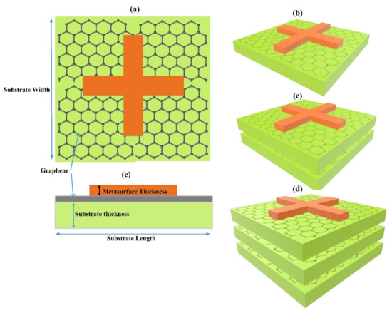 - Lakshmiprabha, K.E.; Govindaraju, C.; Mahendran, G. Broadband plus-Shaped Metasurface Absorber Based on Graphene for Visible and Ultraviolet Regions. Opt. Quantum Electron. 2022, 54, 774. [Google Scholar] [CrossRef]
