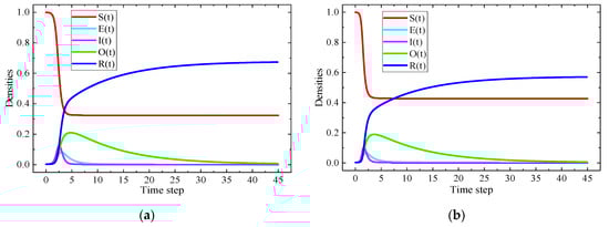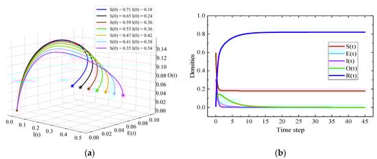 Figure 5a shows the density evolution curves of spreaders, hesitators and rumor debunkers when the initial densities of ignorant people and spreaders are randomly given in 7 groups. The star symbols represent the initial values of densities of each type of individual, the dot represents the steady-state value of rumor propagation. E(0) = 0.05, O(0) = 0.05, R(0) = 0.01, δ = 0.3 and other parameters are set as shown in Table 2. We can find that the density curves of all types of individuals converge to a point E* = (S(t)*, 0, 0, 0, R(t)*) under different initial conditions, indicating that the rumor disappears, which is consistent with the results derived from the previous theory. Figure 5b shows the density evolution curves of each type of individual when S(0) = 0.59, E(0) = 0.05, I(0) = 0.3, O(0) = 0.05, and R(0) = 0.01, which coincides with Figure 5a.