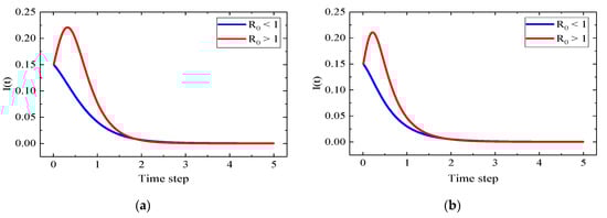 In order to clearly observe the effect of R0 on rumor propagation, we assumed that there are 750 spreaders at the initial time, i.e., I(0) = 0.15 (only set as such in this section). Then we observed the changes of the spreaders when R0 < 1 and R0 > 1.
