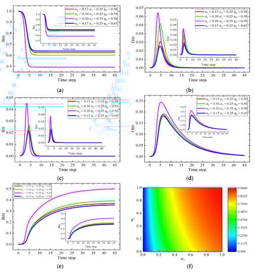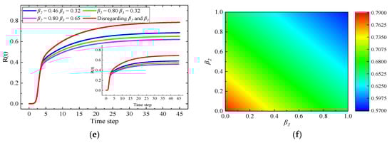 As shown in Figure 7a, with the increase in and , the density of ignorant people when they reached the steady state decreases, and the time to reach the steady state is advanced, i.e., the rumor propagation range decreases. In Figure 7b, with the increase in and , the peak density of hesitators decreases. The time for hesitators to reach a steady-state decrease under the influence in and the role of the rumor debunkers on the hesitators is more obvious. In Figure 7c, the influence in on the peak density of spreaders is 0.004 at most, while has a greater impact on the peak density of spreaders. In Figure 7d, with the increase in and , the density of rumor debunkers increases, helping to control the spread of rumors. In Figure 7e, with the increase in and , the density of immunizers decreases, i.e., the negative impact of rumor propagation decreases. In the BA network, the density variation of each type of individual is similar to that in the WS network. This is because the existence of hub nodes in the BA network accelerates the spread of rumor information. The hub nodes make the time for various nodes to reach peak density and steady-state smaller than that in the WS network. Figure 7f shows the variation of the density of immunizers in the WS network with and when time step, t = 45. The increase in and is conducive to reducing the spreading scale of rumors, but it is better to increase first. Because there is a time delay before hesitators become spreaders and hesitators may be refuted by rumor debunkers, the harm is less than that of spreaders.