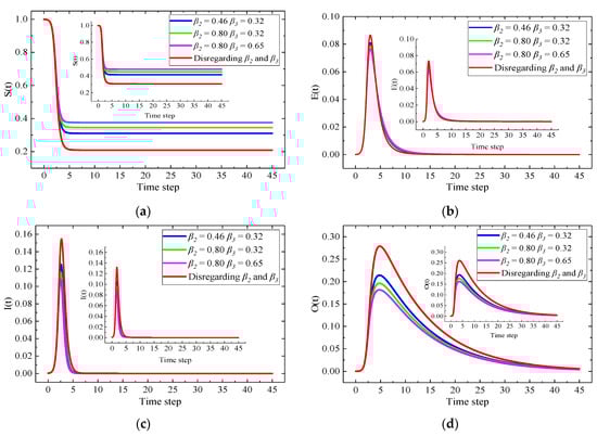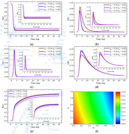 It can be seen that when , i.e., , for all , when , there is , when, and only when E(t) = I(t) = 0. Thus, E0 is the unique solution of V(t) = 0. According to the LaSalle invariance principle [64], when , each solution of Equation (1) is not far from the equilibrium point E0, so the rumor-free equilibrium point E0 = (1, 0, 0, 0, 0) is globally asymptotically stable.