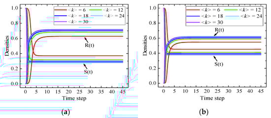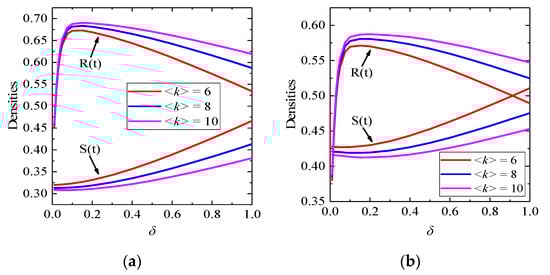 From Figure 9, we could observe that the density of ignorant people when they reached steady state increased with the increase in forgetting rate δ, i.e., the rumor propagation range became smaller and smaller. The density of the immunizers when they reach the steady state first increases and then decreases with the increase in the forgetting rate δ, and is maximum when δ is about 0.15. These results can be explained as follows: when δ is small, the normal state transition could still be carried out between individuals, and the increase in the forgetting rate δ appropriately increases the density of immunizers. However, when the forgetting rate δ continues to increase, the probability of state transition between individuals decreases, and more and more spreaders and hesitators be directly transformed into immunizers, such that the probability of contact between ignorant people and spreaders decreases. As a result, the final density of ignorant people is increasing and the density of immunizers is decreasing. Figure 10 shows the effect of the average degree on the spread of rumors (δ is taken as 0.5 in Figure 10). The greater the average degree , the smaller the density when ignorant people reach the steady state and the greater the density when immunizers reach the steady state. At the same time, as the average degree increases, the densities of ignorant people and immunizers change more rapidly and reach the steady state earlier. Because the greater the average degree , the more friends an individual has, the more chances the rumor spreaders have to contact ignorant people, which leads to the easier spread of rumors. In addition, by comparing the plots in Figure 9 and Figure 10, respectively, it was found that the densities in BA network change more significantly. As mentioned in Section 3.1, hub nodes can accelerate rumor propagation by becoming spreaders, or inhibit rumor propagation by forgetting.