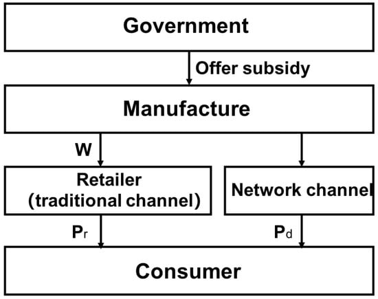 On one hand, as the main body of macro-control, the governments have paid more attention to improving the environmental awareness of enterprises and consumers. To encourage enterprises to develop and produce green products, some governments have introduced a series of incentives and subsidies for green manufacturing to ensure that economic growth is stable and environmental benefits are achieved at the same time. For example, the US Department of Energy implemented a management loan program to accelerate the commercial deployment of innovative new clean technologies and invested $30 billion to support more than 30 projects in different green industries [6]. In 2012, the European Commission invested 41.8 million euros in the green campaign for electric vehicles and funded energy technology research and development [7]. In 2016, the Scottish government spent 70 million pounds on subsidies to encourage the circular economy [8]. Moreover, in the Notice on Promoting the Green Development of E-commerce Enterprises [9] issued by the Ministry of Commerce in 2021, the Chinese government emphasized the importance and necessity of green development, which can ensure the high-quality development of e-commerce and also pointed out that building a modern economy should rely on green development. According to the above research, members of the supply chain can get incentives through various government subsidies. Therefore, to establish a system of sustainable green supply chain, it is necessary to bring government subsidies into the system for decision-making research.