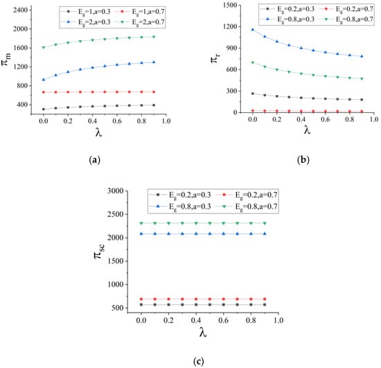 By introducing the above optimal solution into Equations (1)–(4), the manufacturer’s optimal profit , the retailer’s optimal profit and the supply chain’s profit can be obtained.