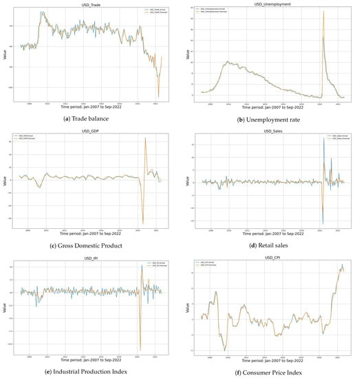 - Retail sales (Figure 3d). We see in the graph how the predicted data are always more conservative than the actual data, indicating that analysts expected (for both positive and negative values) lower values than the actual data. We can see that before the pandemic, retail sales were very limited between −5% and 5%, but this ceased to be the case with the arrival of the COVID-19 pandemic, during which, sales initially fell to −18.1%, largely recovering in the following months after this fall, with values close to 8%. We can see that the predicted value of retail sales is below the actual value, even during the pandemic and in the following years.