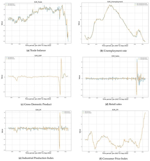 - Retail sales (Figure 2d). European retail sales had a fairly narrow range of values until 2020, varying between +2% and −2%. In March 2020, due to the COVID-19 pandemic, negative values soared, and it is particularly striking that the market expected a value of −15%, but fortunately for the economy, this value did not exceed 11.7%. For the rest of the values in the series, we can see that the forecast takes much more conservative values than the real value.