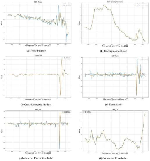 - Trade balance (Figure 3a). The UK trade balance has been negative throughout the period, with the only notable moment of positive balance being at the beginning of 2020. Thereafter, the volatility of the data increased considerably. At the beginning of 2022, the trade balance reached its minimum value of −26.5 B. It should be noted that the forecast value is much more moderate than the actual value, especially in periods where volatility increases, as the expected data do not match the actual value.Figure 3. Plot showing the time evolution of the 6 macroeconomic news items from the United Kingdom (UK) for the time period analysed between June 2007 and September 2022. The current value of each time period is marked in blue, and the predicted value in orange.