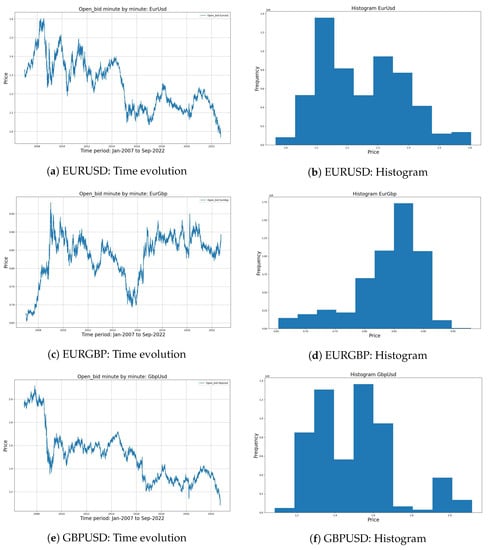 In this section, we provide an exploratory analysis of the three currency pairs used in this paper: euro/US dollar (EURUSD), euro/pound (EURGBP), and pound/US dollar (GBPUSD). The data were extracted from the Free FOREX Historial Data repository available at http://www.histdata.com/ and consulted on 19 September 2022. The open bid price series was collected. The frequency of the data extracted was minute by minute. Due to the granularity of the data, data were missing. To deal with this, we used a simple deterministic imputation technique called Last Observation Carried Forward (LOCF), which involved filling the missing data with the previous value that we did have [].