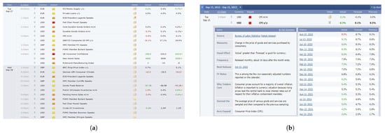 (a) A sample calendar including macroeconomic news from the three economic regions under consideration for 27–28 September 2022; (b) data collection process for identifying the US Consumer Price Index macroeconomic news in September 2022.
