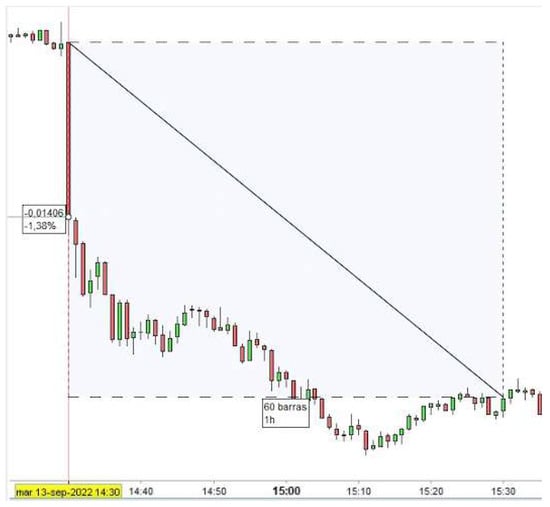 For our example, we decided to examine the distance in the 60 min after the news announcement, i.e., from 14:30 to 15:30. In that time interval, we measured the difference in pips in terms of the opening price of the EURUSD currency pair. In Figure 6, it can be seen that there was a quite considerable price reduction during our 60 min interval, dropping from 1.01684 to 1.00278. That is, there was a price reduction of − 0.01406. Recall that a pip is the fourth decimal place of a quote of the selected currency pairs, meaning that, using the original result of − 0.01406, we had to multiply it by 10,000 to obtain that amount expressed in pips, being in this case equal to 140.6 pips. These data would correspond to an observation of the time series that we would have to generate to collect the information about the impact (through differences in pips) of the publication from this news on the EURUSD price movements. We repeated the process to generate the rest of the time series from the macroeconomic news, the three currency pairs, and the three time frequencies considered (15, 30, and 60 min).