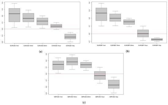 The null hypothesis is , where is the Pearson’s correlation coefficient and its equation is , with being the covariance and the standard deviation. In this case, the variable a is the information surprise data series, and the variable b is the exchange rate deviation series for the frequencies considered. Once all the correlation coefficients and their corresponding p-values were estimated, we applied the decision rule to decide whether or not to reject . That is, we compared the p-values with the significance level () used equal to 5%. If the p-values were less than or equal to , then we would reject . Therefore, in this assumption, we would be affirming that there is a relationship between the information surprise and the movement generated for a given time interval. In the case of not rejecting because the p-values were greater than , the correlation coefficient would be equal to 0, and there would be no relationship.