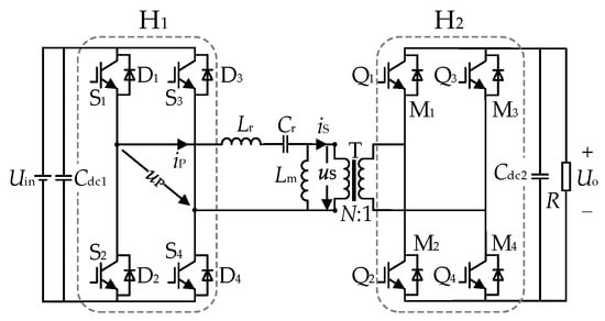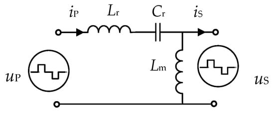 The LLC-DAB DC-DC converter can be represented by the equivalent circuit model shown in Figure 2. The two AC voltage sources, uP and uS, are connected through an LLC resonant tank. The magnitude and direction of the power transmitted by the converter are determined by the amplitude, phase and frequency of the voltages on both sides of the LLC resonant tank. Power is transmitted from the P side to the S side for forward power flow when the phase angle difference between the voltages of the two sides is positive. On the contrary, power is transferred from the S side to the P side when the phase angle difference is negative. The power of DAB is always transferred from the phase-leading side to the phase-lagging side.