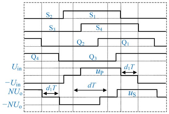 In addition, all drive signals of DAB are square wave signals with a 50% duty cycle, and the signals of the upper and lower two switching tubes of each bridge arm are complementary. There are two control variables in the DPS modulation, which are d1 and d. The corresponding dT is the phase shift time between the symmetry axes of uP and uS, and d1T is the phase shift time between the drive signals S1 and S4. Figure 3 shows the switching sequences of each switch and the voltage waveforms of each side of the LLC-DAB converter with DPS modulation, where uP and uS are both three-level AC square wave voltages with the same frequency.