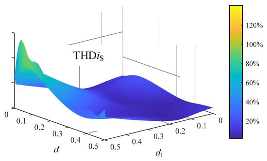Substituting (13) and (14) into (6) and (7), respectively, the THDi at the P side and S side can be obtained with different k. Assuming k = 1, the 3D surface of THDiP with different phase shift ratios is shown in Figure 5. When d is determined, THDiP tends to increase as d1 increases. When d1 is determined, and d is close to 0, THDiP increases sharply and eventually rises to infinity at d = 0. The 3D surface of THDis with different phase shift ratios is shown in Figure 6. When d is determined, THDis also tends to increase as d1 increases. When d1 is determined, there is no significant change in THDis. It can be indicated from Figure 5 and Figure 6 that THDi varies considerably with different phase shift ratios d1 and d and is so large in some modulation regions that it is not negligible. Therefore, it is difficult to accurately calculate the instantaneous values of the currents iP(t) and iS(t) if only the fundamental components are considered.