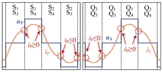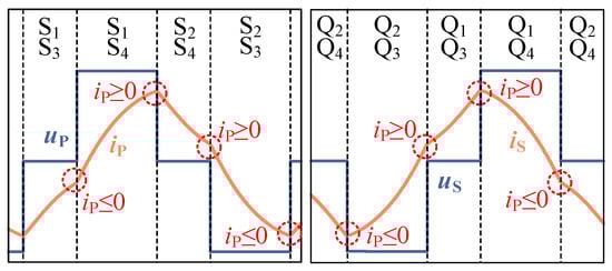 The elimination of backflow power facilitates the reduction of the conduction losses of the converter. To reduce the switching losses, soft-switching technology is one of the effective measures, which is essential to reduce the voltage or current of the switch to zero before the switching action occurs. For DAB converters, the soft-switching is generally realized by forcing the current through its anti-parallel diode before the switch is conducted. The main voltage and current waveforms of the converter to realize soft-switching are shown in Figure 8. Based on the condition of zero-voltage conduction and the time-domain characteristics of voltage and current at the P side and S side, it can be obtained that the conditions of zero-voltage conduction for the four switches of the H1 bridge are (19) and (20), corresponding to iP(t0) and iP(t1) in Figure 8, respectively. The conditions for the four switches of the H2 bridge to realize zero-voltage conduction are (21) and (22), which correspond to iP(t2) and iP(t3) in Figure 8, respectively.