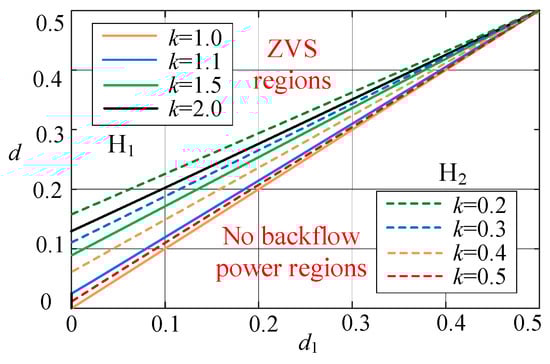 The no backflow power and soft-switching modulation curves of the LLC-DAB converter with different k, calculated based on the system parameters in Table 1, are shown in Figure 9. The solid line in Figure 9 is the modulation curve of the H1 bridge, which represents the phase shift ratio obtained from the solution of (23). These phase shift ratios of the converter can realize the soft-switching and no backflow power operation of the H1 bridge, which is also the critical soft-switching and critical no backflow power operation state of the H1 bridge. The dashed line is the modulation curve of the H2 bridge, representing the shifted phase derived from the solution of (24), which realizes the soft-switching and no backflow power operation of the H2 bridge, and also the critical soft-switching and critical no backflow power operation state of the H2 bridge. The upper side of the modulation curve corresponds to the soft-switching operation design region for each of the respective full bridges. According to Figure 9, it can be seen that when k < 1, the four switches of the H1 bridge will realize soft-switching operation in the full modulation region, but no backflow power operation of the H1 bridge cannot be realized. For k ≥ 1, the soft-switching operation region is gradually reduced as the increment of k. For k ≤ 0.5, the soft-switching operation area of the H2 bridge gradually expands with the increase of k. For k > 0.5, the soft-switching operation of the four switches of the H2 bridge can be realized in the full modulation region, but the no backflow power operation of the H2 bridge cannot be realized. Therefore, to ensure that the converter features a sufficient range of optimal operating conditions, the transformer ratio should be determined according to the actual situation, and k should be reasonably designed. The expressions are complicated since the time domain expressions for the currents iP and is contain many harmonic components. To simplify the calculation in the control process, the soft-switching and no backflow power design curves of the H1 bridge and H2 bridge with different k are fitted, respectively. And the conditions for zero voltage condition and critical no backflow power of H1 and H2 bridges can be obtained, as shown in (25) and (26).