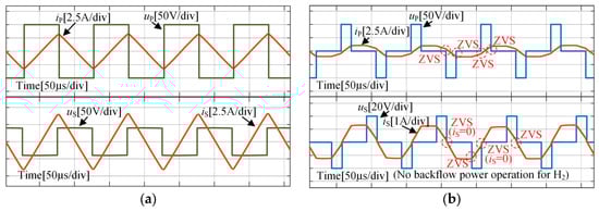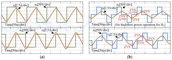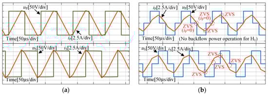 Steady-state waveforms with two control methods in LCL resonant tank when Uin = 50 V and k = 1. (a) SPS modulation; (b) Soft-switching and no backflow power control.