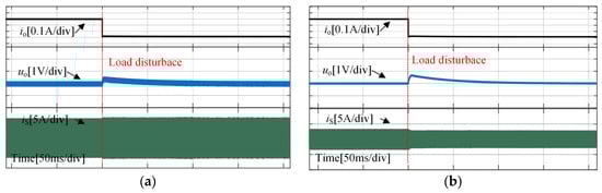 To test the transient response characteristics of the system after a change in the operating state, the transient response waveforms of the output voltage and transformer current with the two control methods mentioned above are given when the input voltage Uin changes from 100 V to 80 V, as shown in Figure 14. The transient response waveforms of load current, output voltage and transformer current when the load R changes from 50 Ω to 70 Ω with the two control methods are shown in Figure 15. It can be seen that the voltage fluctuations with the proposed control method and SPS modulation method are small, and their responses are very fast for both input voltage disturbance and load disturbance. The simulation test results show that the control method proposed in this paper features a good transient response to the disturbance.