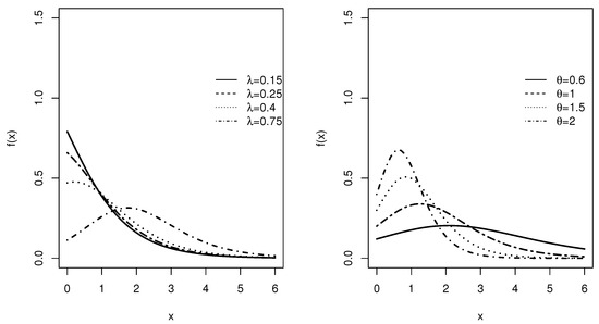 Let us examine the shapes of the PDF and HRF for the case of the exponential baseline distribution. Let the random variables have the exponential distribution with scale parameter . If we set and replace it in (5), we will get the LiE1 distribution. Its PDF is for