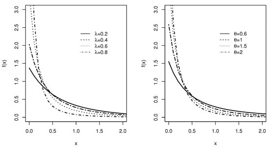 The plots of the density function of the LiE2 distribution for various choices of parameters with (left) and (right).