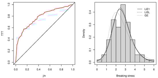 A TTT plot is a diagnostic tool in the sense that it gives an insight about the aging properties of the underlying distribution. Then, one can choose an appropriate lifetime distribution for modeling the data. For example, when the plot is concave, a life distribution with an increasing failure rate should be used. The TTT plot for the Carbon data set is sketched in the lhs of Figure 10. It can be seen that it is concave. Thus, a model with increasing failure rate like LiE1 should be used.