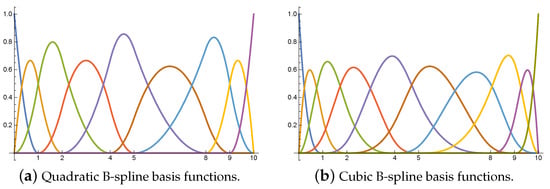 The B-spline basis functions are nonnegative and have local support (i.e., is a nonzero polynomial on ). In addition, the B-spline basis functions form a partition of unity for [27]. Figure 1 shows the cubic and quadratic B-spline basis functions defined in .