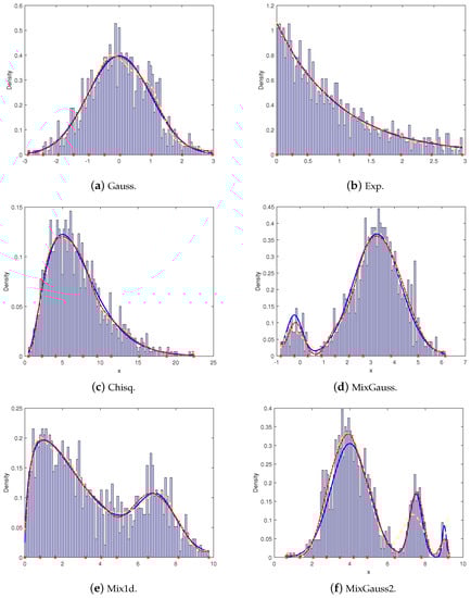 Table 4 and Table 5 show the results compared with the previously mentioned probability density function estimation methods, including the orthogonal sequence of [7,13], the kernel estimators using three strategies to the bandwidth selected, that is, the rule-of-thumb method, which is based on the asymptotic mean integrated square error (ROT) [38], the least squares cross-validation method (LCV) [38], and a method proposed by Hall et al. based on the straightforward idea of plugging estimates into the usual asymptotic representation for the optimal bandwidth but with two important modifications (HALL) [39]. The experimental results of the B-spline function estimation used the values of the MAE and root-MSE.