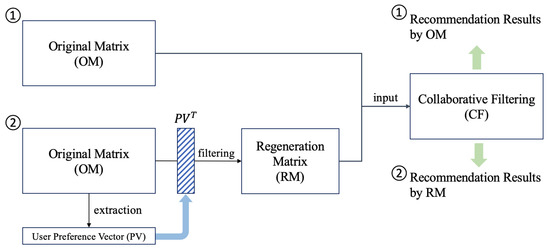 To achieve this, we first extract the category ratio of the selected items for each user. Thereafter, we apply the extracted information, namely the category ratio, as a filter for the user–item matrix and regenerate the matrix. Therefore, the existing user–item matrix is regenerated based on the category ratio. This regenerated matrix (RM) is assumed to be more user appropriate than the conventional matrix and is applied to the CF. The results are compared with those obtained through the existing matrix. Moreover, we test the sparsity of the regenerated and original matrices, and demonstrate the improvement in the sparsity and accuracy in our approaches. We use the MovieLens dataset (https://grouplens.org/datasets/movielens/, accessed on 26 November 2020) and consider the genre information of the movie as category information in the experiments.