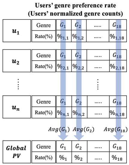Normalization is applied to the frequency vectors because, depending on the total number of selected genres, the preference ratio may vary for each user. We derive the PVs taking into account the proportion of the selection-based preferences of these users. Therefore, the preferences can be considered as a percentage of the genre selected by the user.