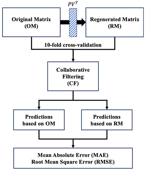 We applied the regenerated matrix (RM) and original matrix (OM) to collaborative filtering (CF), and analyzed the results. Figure 5 presents the entire experimental process. In our experiments, we do not provide the environments for experiments since our approaches including collaborative filtering have no real-time issue. Because of this reason, we show the experimental process and the results of our test. We first describe the CF approaches utilized for our experiments. Then we provide and analyze the experimental results using RM and OM as input for each CF approach.