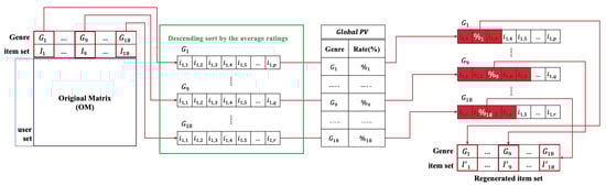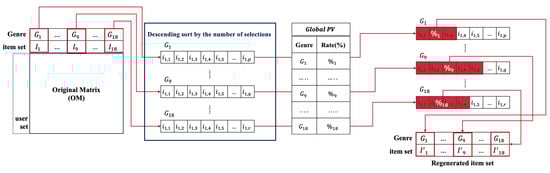 In Figure 4, for the matrix regeneration, we first classify the items by genre in the OM. Thereafter, we reconstruct the items in the OM based on . For example, suppose that there are 100 items in classified from the OM. Assume that the ratio of in is 10%. Based on this ratio, we extract 10, which is 10% of the total of 100 items in of the OM. We apply this to , and, subsequently, the items to which the genre ratio of is applied are extracted from the OM.