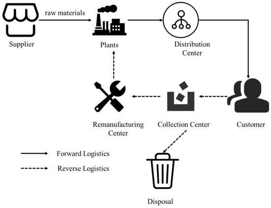 The concept of RL was put forward by Stock [1] in 1992, whose essence was to transfer EOL products from the consumer to the producer for processing. The COPs in RL include facility location and the vehicle-routing problem (VRP). The facility location is to build an appropriate network structure to determine the location of various facilities, such as collection centers, remanufacturing centers, distribution centers, etc. The VRP is to formulate a specific transportation plan to transport EOL products to the above facilities, including the driving path, number of vehicles, types of vehicles, etc. There are some reviews about the facility location and VRP in RL [2,3,4,5].