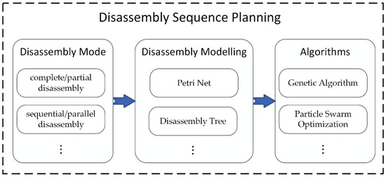 The most common objective of DSP is to improve the disassembly efficiency and reduce the cost. Disassembly sequence planning can be divided into three steps as shown in Figure 5: First, choosing a suitable disassembly mode which could be complete/partial disassembly or sequential/parallel disassembly. Second, building a model about the disassembly relationship of parts or components of EOL products. Third, choosing an optimization method to solve the DSP problem. There has been a great amount of research on DSP, and various methods have been developed. The most commonly used methods are heuristic algorithms. Additionally, the most prominent advantage of the heuristic algorithms is that they can obtain high-quality solutions in an acceptable time for large-scale problems [115]. For example, Tseng et al. [116] developed a new block-based genetic algorithm (GA) with the penalty function matrix in the crossover and mutation mechanism for disassembly sequence planning. Similarly, ElSayed et al. [117] and Li et al. [118] used a GA to address DSP on different occasions. It is obvious that a GA is easy to use and effective. However, more and more studies have investigated other heuristic algorithms. Zhong et al. [119] solve the DSP including fasteners using Dijkstra’s algorithm and particle swarm optimization (PSO), which is another metaheuristic algorithm. Guo et al. [120] proposed a lexicographic multi-objective scatter search method to overcome the complexity explosion caused by a large-scale DSP considering a multi-objective resource-constrained operation. Liu et al. [121] built the disassembly model by using the modified feasible-solution-generation method, and a robotic DSP was solved by using an enhanced discrete bee colony algorithm. Additionally, Tao et al. [122] proposed an improved Tabu search heuristic algorithm with an exponentially decreasing diversity management strategy; a partial and parallel DSP problem was solved to show the proposed algorithm was feasible and efficient. Guo et al. [123] and Ren et al. [124,125,126,127] investigated various types of DSP problems by using different heuristic algorithms. In summary, a heuristic algorithm is one of the most effective methods to solve DSP.