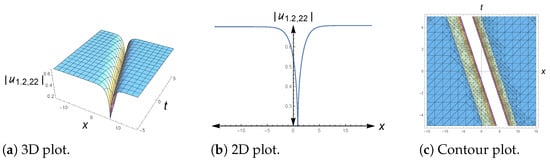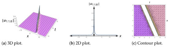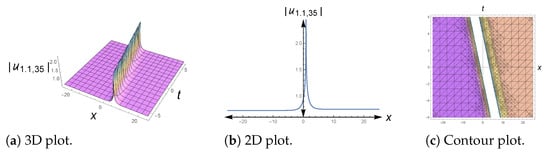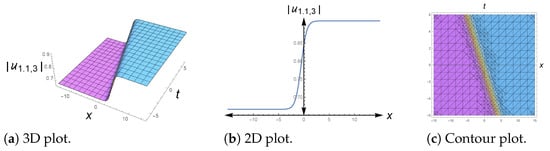 Hence, we obtain a system of algebraic equations that can be solved by Mathematica software to obtain the unknown constants , and . Therefore, various forms of solutions can be raised for Equation (3).